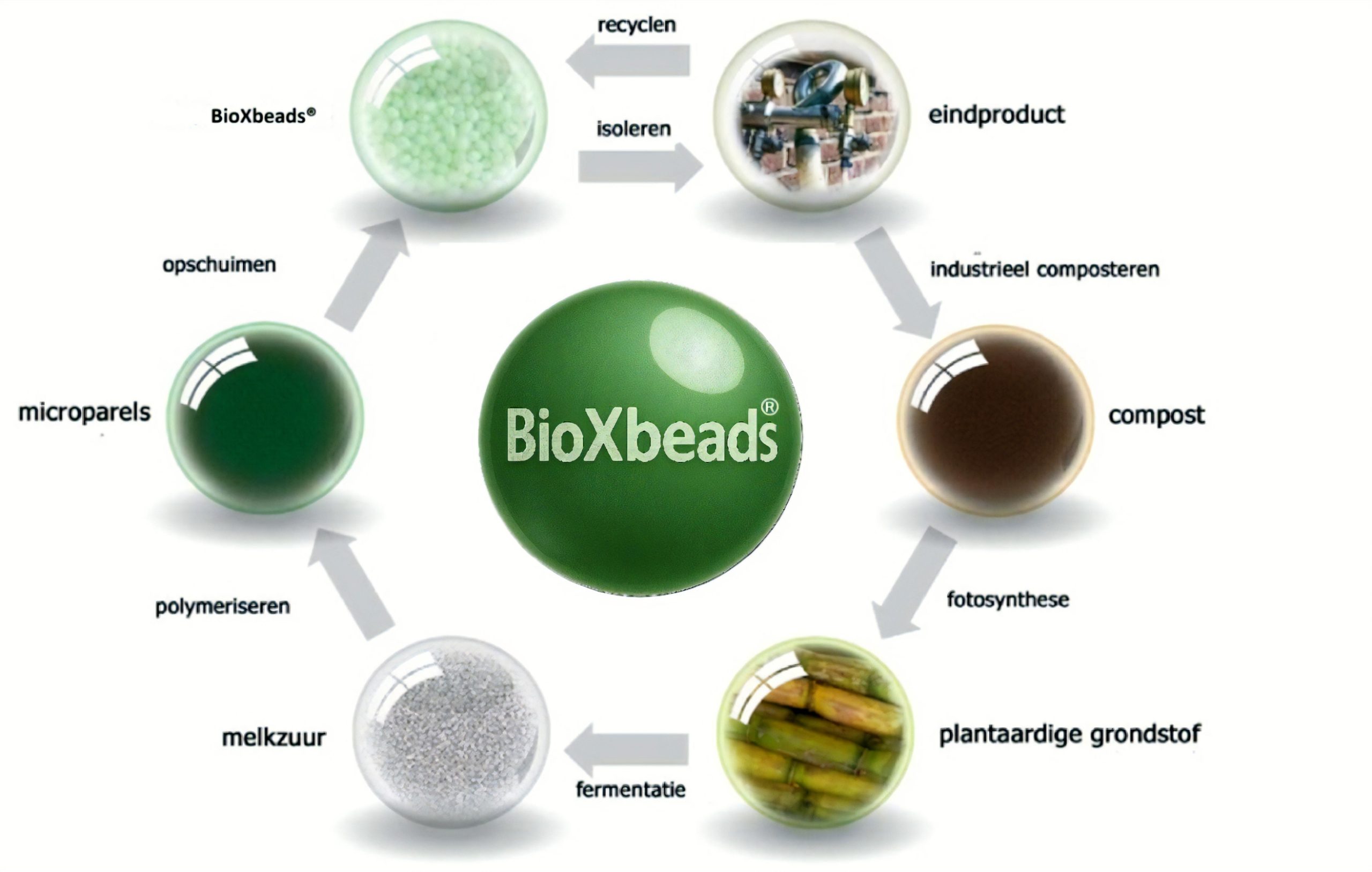 BioXbeads® zijn gemaakt van melkzuur die door middel van polymerisatie tot polymelkzuur (PLA) zijn gemaakt. Van ons specifiek ontwikkelde recept polymelkuur maken we hele kleine korreltjes (microbeads) die we impregneren met koolzuurgas. Dit koolzuurgas is identiek aan het koolzuurgas wat men in frisdranken gebruikt. Met stoom expanderen we de microbeads tot geëxpandeerde polymelkzuurparels (EPLA) die er hetzelfde uitzien als EPS parels.