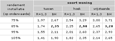 In onderstaande tabel is aangegeven welke energiebesparing per m² vloeroppervlak gedurende het stookseizoen kan worden bereikt met Bodemhygrolatie® en met vloerisolatie (R=1,3) onder steenachtige vloeren.