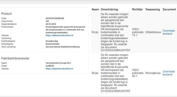 U krijgt dan een lijst op uw scherm met alle gelijkwaardigheidsverklaringen van Termokomfort inclusief de gelijkwaardigheidsverklaringen met Rbw en Rbf waarden.
